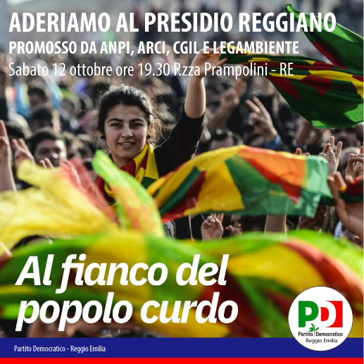 Il Partito Democratico di Reggio Emilia aderisce al presidio promosso da Cgil Anpi Arci e Legambiente ”fermiamo l’invasione Turca in Siria: Stand Up for Rojava” di Sabato 12 ottobre per chiedere che cessino immediatamente le ostilità e si fermino le manovre di invasione del territorio siriano.