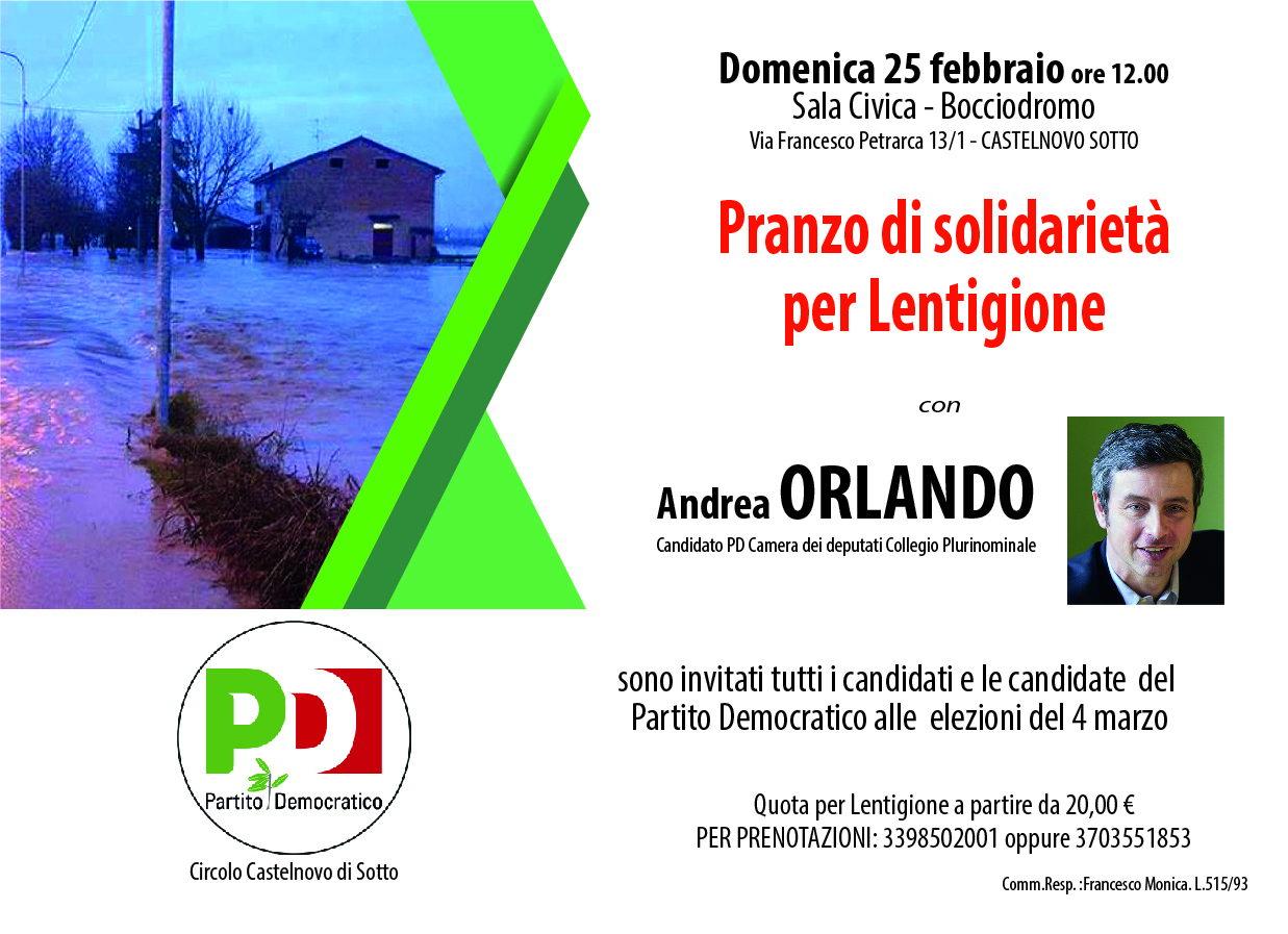 Il PD di Castelnovo Sotto organizza per domenica 25 febbraio (ore 12) presso la sala civica di via Petrarca un pranzo solidale per Lentigione. Interverrà anche Andrea Orlando, candidato Pd alla Camera dei deputati collegio plurinominale. Il segretario del Pd locale Francesco Monica assicura: “Le nostre rezdore insieme ai volontari di Castelnovo Sotto sono già a lavoro per accogliere quanti vorranno ritrovarsi insieme e fare un gesto solidale e di comunità a favore delle popolazioni alluvionate di Lentigione di Brescello. I fondi che raccoglieremo domenica saranno depositati sul conto corrente aperto dalla Provincia”.