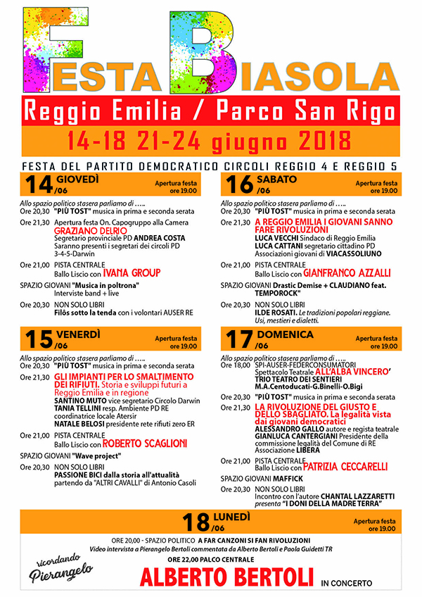 REGGIO EMILIA, 9 GIUGNO - Saranno il capogruppo alla Camera Graziano Delrio e Andrea Costa, segretario provinciale del PD, ad aprire Festa Biasola 2018, giovedì 14 giugno alle 21,30. L’attualità della situazione politica e parlamentare dopo l’insediamento del governo che vede il PD all’opposizione, sarà al centro della prima serata. In Biasola il programma si articolerà in due fine settimana: il primo dal 14 al 17 e poi da giovedi 21 a domenica 24 giugno.