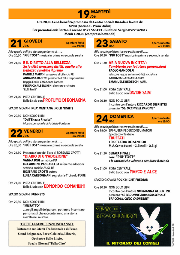 Come sempre si conferma il format di Festa Biasola: buona cucina, le migliori orchestre di liscio e l’intrattenimento musicale alla gelateria del gruppo “più tost”, un bel concerto ma anche tante occasione per riflettere ed incontrarsi.