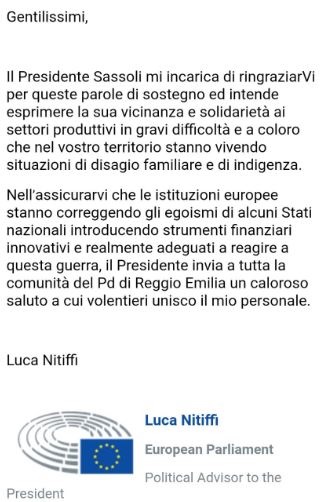Lettera del PD Reggio 6 al Presidente del Parlamento Europeo David Sassoli e relativa risposta