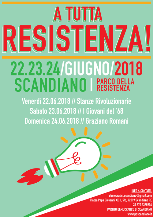 SCANDIANO - A TUTTA RESISTENZA, a Scandiano, al Parco della Resistenza, da venerdì 22 a domenica 24 Giugno, arriva la nuova Festa del Partito Democratico locale. Musica, birra, panini, piadine, handmade e fotografia saranno protagonisti della festa che partirà venerdì sera e si protrarrà per tutto il week end. Il programma venerdì 22, "Stanze rivoluzionarie a tutta resistenza", per tutta la serata si alterneranno sul palco diverse band emergenti. Sul palco dalle ore 20,30 Il Re, Sandro Pezzi & 2 Strings, Rufus Party, Almost Dude e ОРТОДОНТИЯ - ORTODONZIA Sabato 23 giugno, la Festa Democratica prosegue a partire dalle 20.30 con il professor Francesco Maria Feltri che parlerà del '68 in un incontro dal provocatorio titolo "68: molto rumore per nulla?" A seguire "Revolution Dj Set" a cura del mitico Mirko Colombo che ripercorrerà i più grandi successi degli anni ‘60 e ‘70. Domenica 24, si chiude con il concerto live “A tutta Resistenza" di Graziano Romani, un viaggio nell'America dei cantautori da Woody Guthrie a Dylan senza dimenticare Bruce Springsteen.